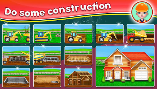 Clear the area of unwanted trees and load them onto trailers using a woodcutter. Remove unwanted grass using a GCB and eliminate stones with a stone crusher. Dig the foundation area and ensure proper cleaning of builder vehicle tools in the garage, just like washing a car at home. Pour river sand, limestone, and asphalt into the pit to reinforce the basement. Add iron rods or rebars to increase the building's longevity. Install a drainage line and heating system in the basement. Construct the basement floor and walls using a concrete mixture. Build wooden blocks, create an exterior pattern, roof the house, and install windows, walls, doors, balconies, stairs, and finally, cultivate plants and create a lawn in the yard using gardening skills.
