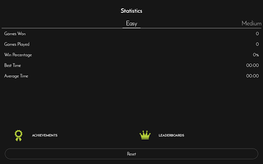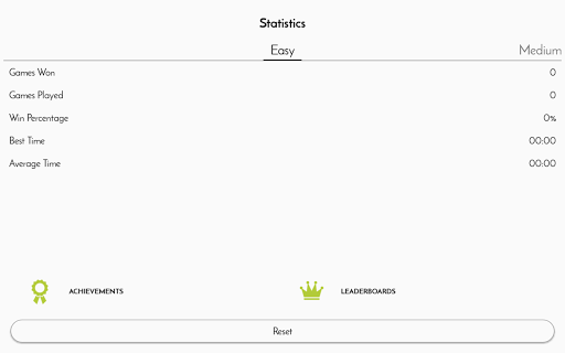 • Statistics to track your progress for each difficulty level showing number of sudoku games played, win percentage, best and average times etc.