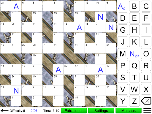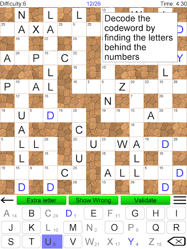 For those unfamiliar with Codeword puzzles, they provide a grid of words, similar to a normal crossword, but with no clues, rather a few initially provided letters, and a number in each square in the gird to indicate its (as yet unknown) letter. All boxes with the same number must use the same letter. From that information and the few initially provided letters it is possible to work out which words will fit in the boxes. Hence you are decoding (or decyphering) the numbers into letters to reveal the hidden words. Usually all 26 letters of the alphabet are used in the codeword, although not always (and unused letters appear crossed out in the keyboard). It is fun, challenging, and a real brain teaser.