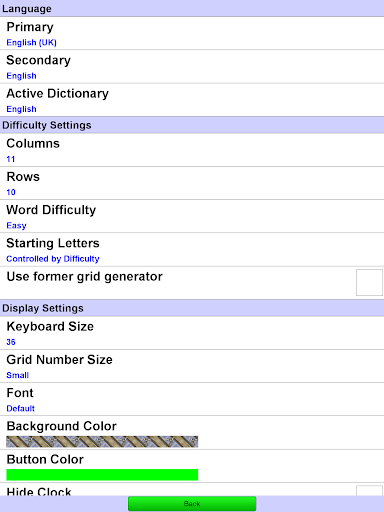 3) Difficultly level can be specified by the user, which determines the pool of words the generator will use. The larger the pool the greater the difficulty. There is even an early learner mode with a limited number of words, aimed at English language learners. The number of starting letters can also be specified. Higher scores can be obtained with more difficult codewords
