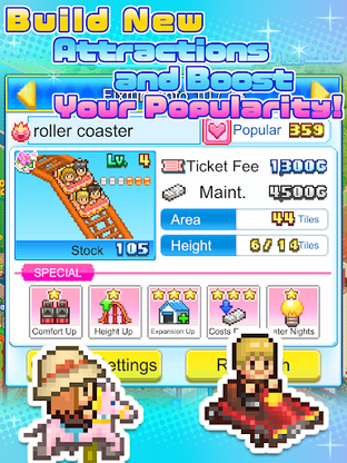 Running low on room to create new amusement rides? Don't worry; one call to your helpful neighborhood construction crew can solve that problem by growing the boundaries of the amusement park. This will unlock additional attractions including massive Ferris wheels and high-speed roller coasters that will grab the eye of new customers passing by.