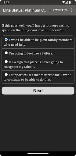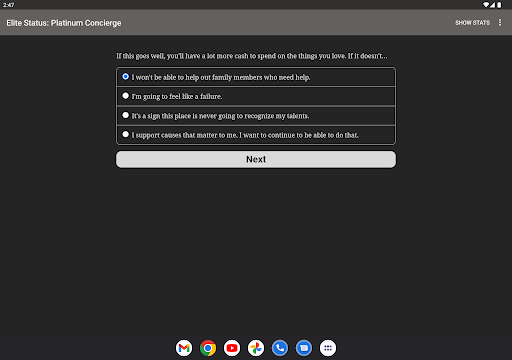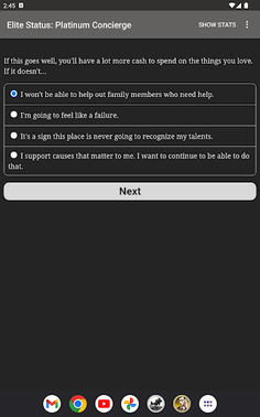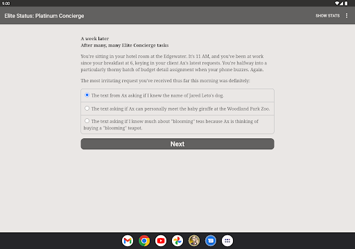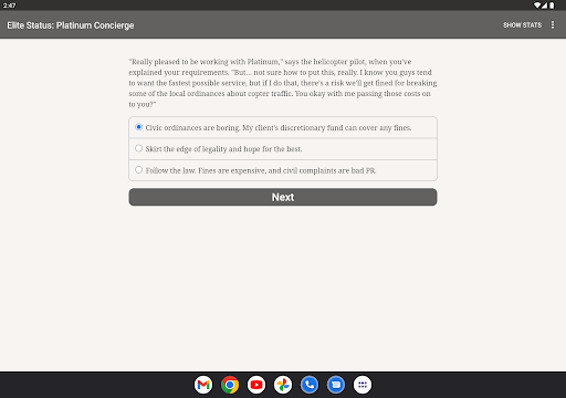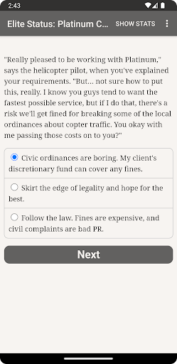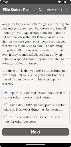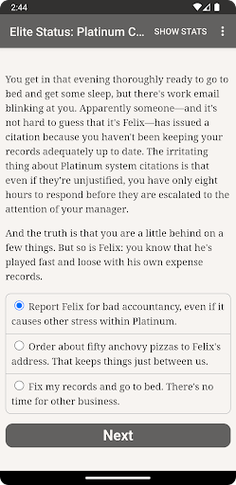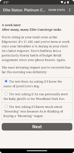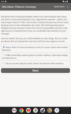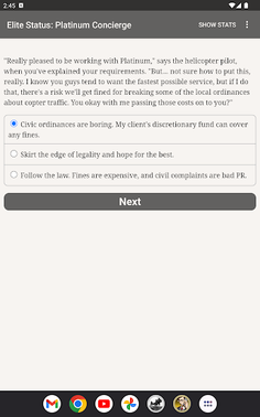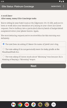 "Elite Status: Platinum Concierge" is a 500,000-word interactive contemporary drama by Emily Short, with additional content by Harris Powell-Smith, where your choices control the story. It's entirely text-based—without graphics or sound effects—and fueled by the vast, unstoppable power of your imagination.