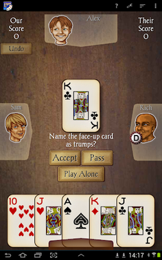 ★ Top Developer (awarded 2013) ★ Euchre – the popular contract trick-taking card game for 4 players, brought to the Android market by AI Factory – is developed to the same high standard as the rest of our apps with an easy-to-use interface, smooth gameplay on all handsets, clear stylish graphics and individual CPU player “styles”.