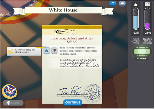 Some of the new features in this enhanced version of Executive Command include new war scenarios, more bills for presidential review, the assistance of a new Secretary of State for diplomatic tasks, a variety of new presidential avatars, and refreshed content and game features. Register for an iCivics account to earn Impact Points and game-based achievements!