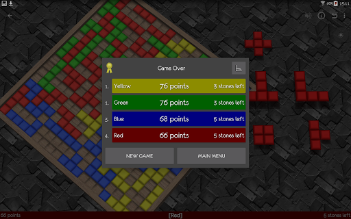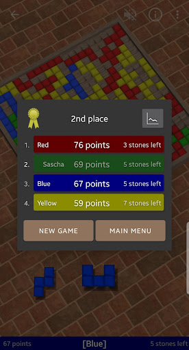 For each player, the squares of all their tiles on the board are added up. Finishing a game with all stones placed on the board gives a 15 points bonus. If the monomino is placed last, you will get a 20 points bonus. The player with the most points wins.