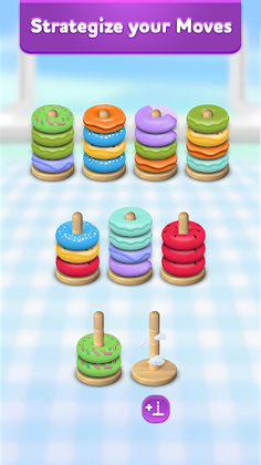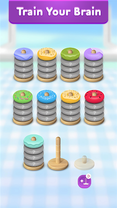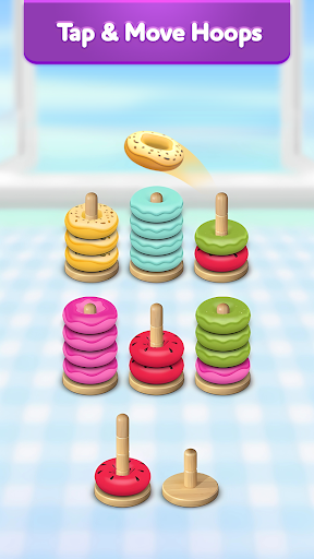 Forget about the boring 2D Water Sort Puzzle, Ball Sort Puzzle or a blank color Hoop Stack Puzzle that have been saturated the market. Hoop Stack 3D - Color Sort will bring you a full collection of hoops and a variety of backgrounds that bring you to the real world bakery. You will feel the mediation and satisfaction watching the jiggling of the donut hoop and the ASMR sound effect when you move them from one pillars to another