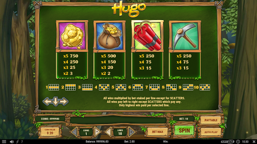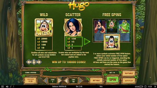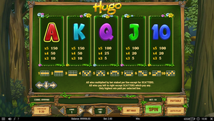 As the game’s wild symbol, the kind-hearted Hugo can substitute for all ordinary symbols to help you comprise winning combinations worth twice the ordinary value on up to 10 active lines. Keep your eyes peeled for Scylla, the vain and vile witch whose pernicious plans involve kidnapping Hugo’s adorable bride Hugoline! When three Scylla symbols appear in any scattered positions on the reels, you win a sequence of 5-15 free spins.