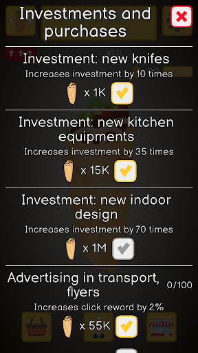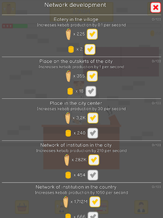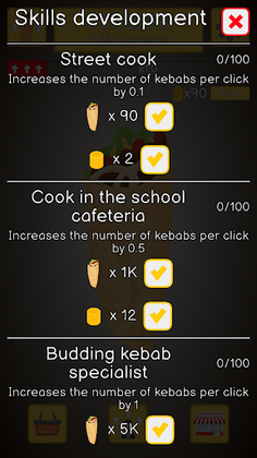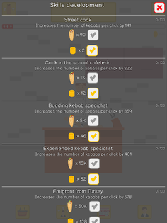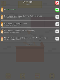 Click more and more often and you will get a lot of kebabs, you can buy new premises that will produce more kebabs, improve your skills and abilities. You can also invest and make a profit from investments. Upon reaching a certain level of improvement, you will be able to change the type of kebabs produced. This will give even more kebabs! The game also has random bonuses that you can win.