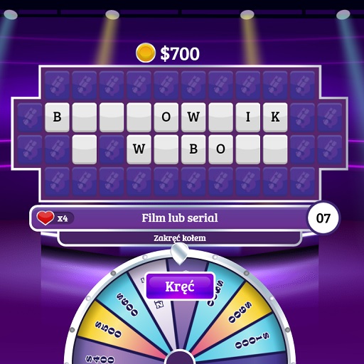 The player spins the wheel and then tries to guess the letters in the password. For each guessed letter, the player receives virtual money, which can also be treated as a score. The aim of the game is to guess the password and score as many points as possible.