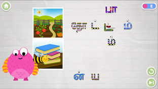 The game has a little cute monster, which helps the children in identifying correct letters and building these words. Each play has two words, its image, and corresponding letters. In each interaction, children will hear the word pronunciations or letter pronunciations, along with the help of the little monster to complete words. The game has 2 modes 1) Easy and 2) Medium for early learners.