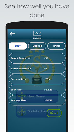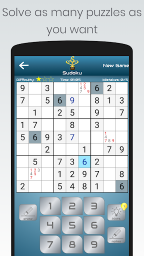 1. Classic 9x9 sudoku game (easy-medium-hard difficulty levels): Players can choose sudoku puzzle depending on their difficulty levels, solve as many sudoku puzzles as they want and see their sudoku game stats. Player can reset these sudoku game stats whenever you want.