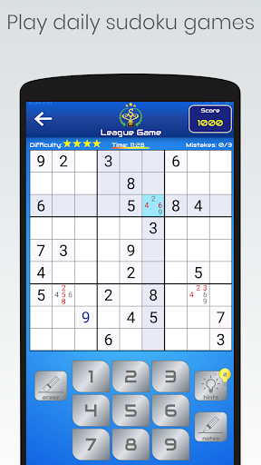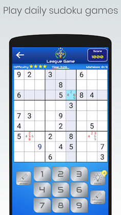 2. SUDOKU LEAGUE: Players solve unique and daily sudoku puzzles (expert difficulty level), get a score after each game and are listed in a leaderboard regarding to their scores. Daily sudoku games in the Sudoku League has time limit of 12 minutes, mistake limit of 3 and 2 hints. Players who solve these sudoku puzzles get a score between 0-1000 pts, regarding to their time of finish, number of mistakes and number of used hints, these scores are submitted to a leaderboard after each game. Players are sorted in the leaderboard regarding to their daily, weekly and all time highest scores. Sudoku game stats for Sudoku League games and the leaderboard can not be reset.