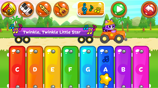 - Play Music freely with different instruments: Xylophone, Piano, Guitar, Flute and Drums