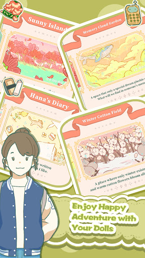 Join your adorable dolls on their journeys filled with thrilling adventures and bountiful resources. Each journey includes its themed location, such as Memory Clod Garden Adventure (Autumn), Sunny Island Adventure (Spring), and Hana's Diary Adventure (Summer), allowing you to engage in diverse and unforgettable experiences.