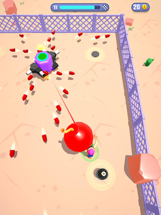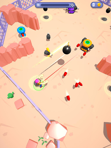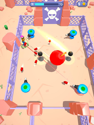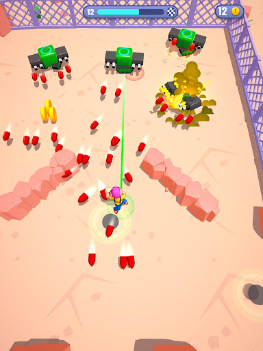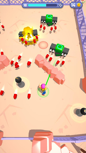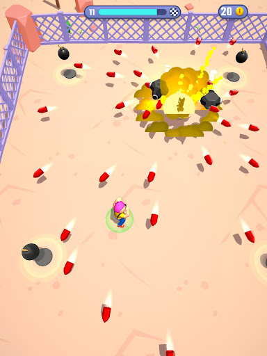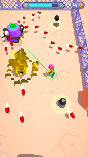 Move to avoid your ennemies and their bullets, collect the bombs on the field and throw them to make them explode!