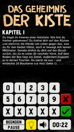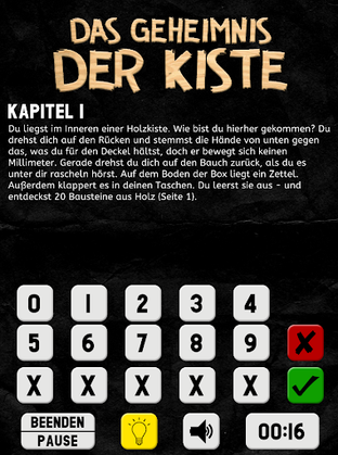 Die App selbst ist kostenlos, in der App steht eine kostenfreie Test-Mission zur Verfügung. In „Das Geheimnis der Kiste“ wachst du in einer Holzbox auf. Wie bist du hierher gekommen? Finde es heraus, löse die Rätsel und entkomme aus der Kiste! Weitere Missionen gibt es für 1,99 Euro (einfachere Spiele) und 3,99 Euro (aufwändigere Spiele) als In-App-Kauf. Nach dem Kauf erhältst du jeweils einen Code, mit dem du dir die entsprechende Missions-PDF auf der Website von LOCKDOWN Adventures herunterladen kannst, um sie auszudrucken.