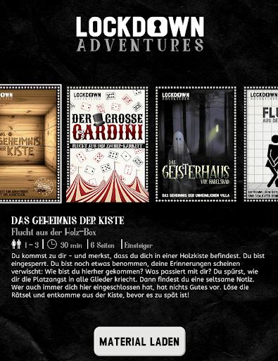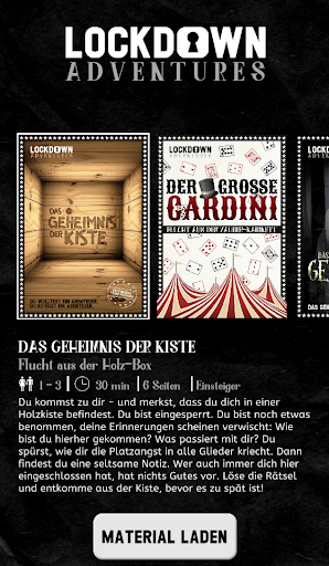 Zu jeder Escape-Room-Mission gehört ein Rätsel-Dokument, das du vor dem Spielen ausdrucken musst. Dort findest du alle Aufgaben, die für das Spiel benötigt werden. Die Unterlagen müssen zum Lösen der Rätsel oft beschrieben, gefaltet, zerschnitten und wieder zusammengeklebt werden. Die liebevoll in Szene gesetzten Rätsel machen Lust auf mehr! Die LOCKDOWN Adventures-App gibt dem Escape Room seinen Rahmen – hier werden die Lösungs-Kombinationen der Rätsel eingegeben. Außerdem gibt es Story-Fragmente, atmosphärische Hintergrundmusik und Hinweise, falls du mal nicht weiterkommen solltest.
