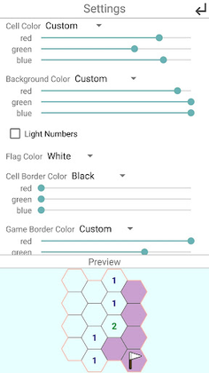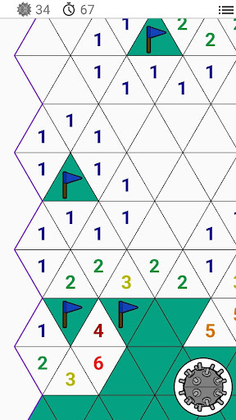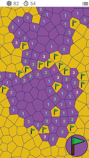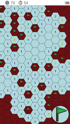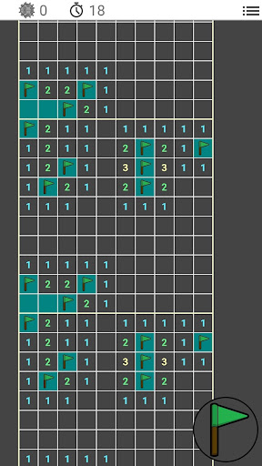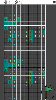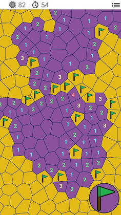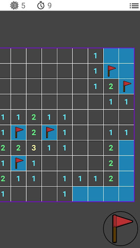 Controls: Tap the circular toggle mode button in the bottom right of the screen to toggle between clearing cells and placing flags. Tap a cell to clear it or flag it, depending on the mode. If you tap on a cleared cell that has all of its adjacent mines flagged, any remaining adjacent cells will be cleared. You can pinch the screen with two fingers to zoom and swipe to move the viewing window.