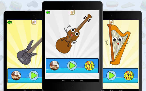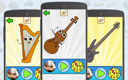Fun and educational app for kids to learn and play with various musical instruments, featuring interactive play, sounds, names, images, and coloring.