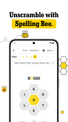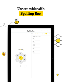 Track your progress for The Crossword, Wordle, and Spelling Bee using the app. Monitor your average solve times, how many puzzles you can solve in a row, or improve your solve rate for The Crossword game. Track your Wordle streak, among other things, and see how often you reach each level in Spelling Bee as you progress in the game.