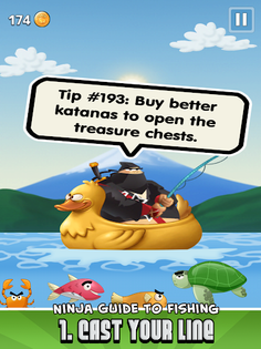 Ninja Fishing features Super addictive Fish and Slash gameplay. Get ready to master both tilt and touch controls to perfection and collect over 130 fish species. With earned gold, buy super upgrades like katanas, boats, fishing guides and more. The game has over 80 rare treasures that can be collected, and players can construct cool buildings in the Ninja Village while fishing on 6 islands (with more to come!).