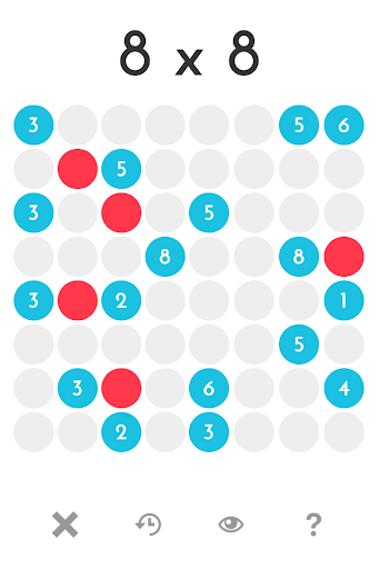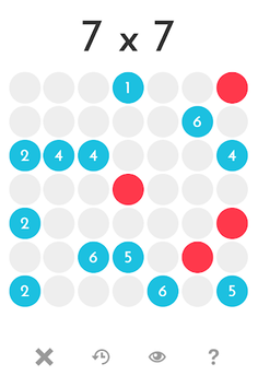 Introducing the companion game of the well-known 0h h1 game, the 0h n0! This charming and demanding puzzle game has its own set of simple instructions: blue dots can only see other blue dots in their row or column and their number determines how many blue dots there are, while red dots hinder their view. Your mission is to fill out the whole grid without having to make any wild guesses. Tap a tile to make it either blue or red, solve the puzzle and move on to the next one. The game offers countless puzzles for different grid sizes, including 5x5, 6x6, 7x7, and 8x8, and now the 4x4 and 9x9 boards are also available!