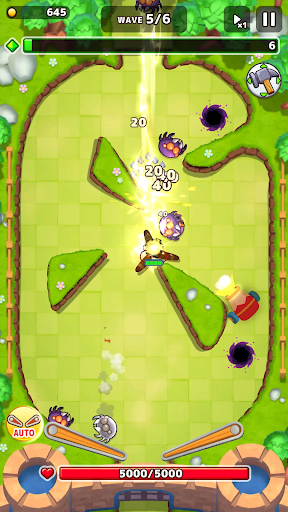 ・With pinball inspired gameplay, enemies drop in from a hole at the top of the screen, and fall towards your base!