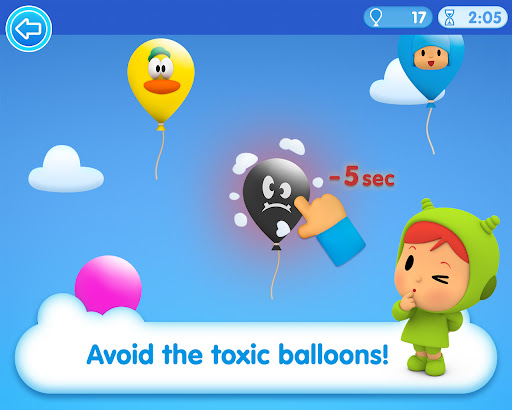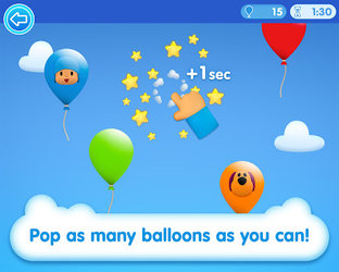 - At the Easy level, coloured balloons simply appear at the bottom of the screen and slowly move upwards. When touched, they pop, making different sounds depending on the type and colour of the balloon. In this mode there is no time limit, so it is ideal for children ages 2 and younger.
