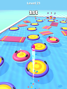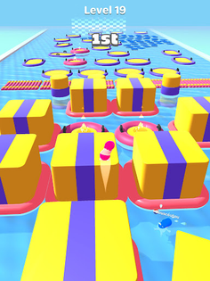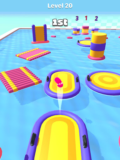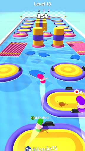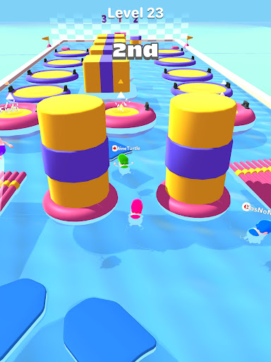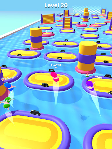 Jump from platform to platform and use the bumpers to be the first to reach the finish line and win the race! Don't fall in the pool, it would slow you down!