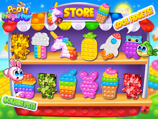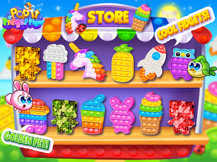 10 Colorful, Happy Fidget Toys to Pop Dimples Away for anxiety relief! Collect Gold Dimple Coins! Unlock Gold Character! Unlock Laser Eyes to Destroy Inflatable Cupcakes! FREE Mini Game – Donut Splat!