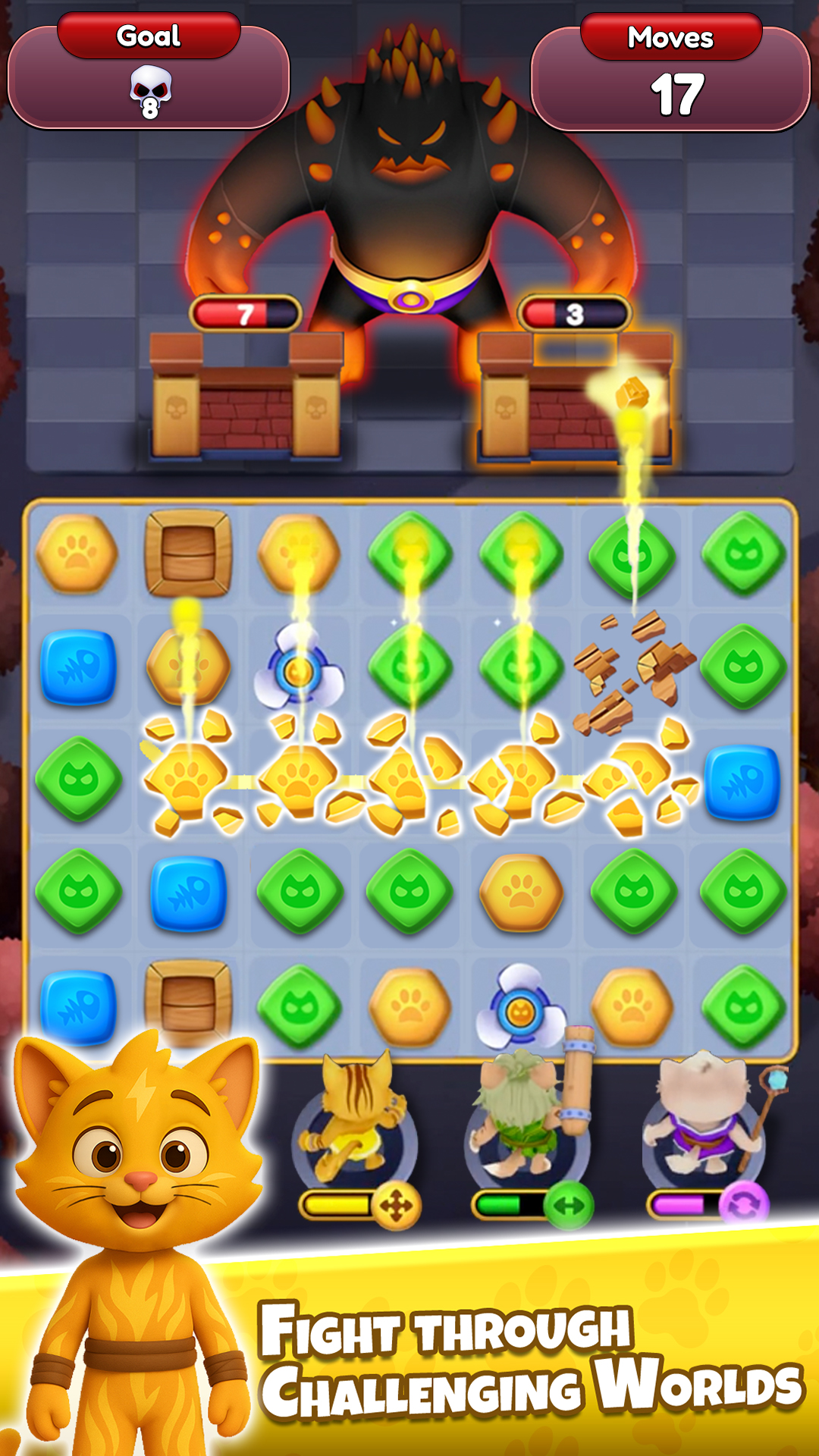 Take charge of a squad of elemental cat guardians - from fiery felines to electric kitties to watery warriors - as you face off against swarms of fiendish monsters and extraterrestrial beings. Engage in combat on a colorful puzzle grid where every successful match unleashes potent attacks to sway the battle in your favor.