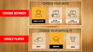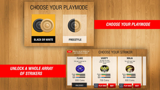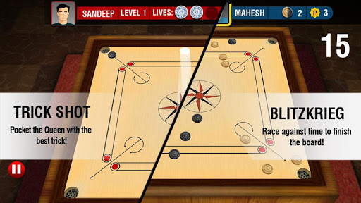 There are four different game modes to choose from: Quick Play - test your skills by having a quick game of carrom, Trick Shot - pocket the Queen challenge and show off your tricks, Timer - finish the boards before time runs out, and Tournament - compete to be the first one to score 25 points and become the Champion!