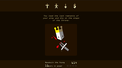 Each year of your reign is fraught with unpredictable requests from your kingdom's factions; the church, the army, the people, and the treasury. Achieving balance between these powerful groups is essential for a long and successful reign, but one wrong move could lead to dire consequences.