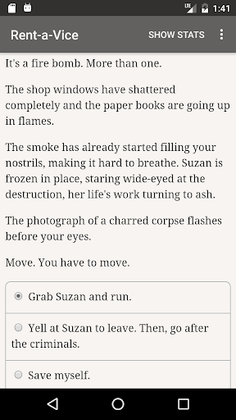 "Rent-a-Vice" is a 150,000-word interactive cyberpunk-noir mystery novel, and 2018 Nebula Award for Game Writing Finalist, by Natalia Theodoridou, where your choices control the story. It's entirely text-based—without graphics or sound effects—and fueled by the vast, unstoppable power of your imagination.