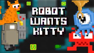Robot Wants Kitty is a platformer game where a robot uses lasers to upgrade and collect a cat, with easy controls and level creation features. GO GET KITTY! (23 words)