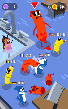 Control your sausage's movements by tapping and holding your screen to maneuver over the sausage wars arena and release to execute your head-banging moves. Use your brute strength to shove rival opponents into obstacles such as sharp utensils, garden fires, and kitchen sinks, causing them to burst into ketchup-like tomato paste, till they are all pushed out of the crowded city. This sausage wars io battle is all about survival of the fittest, and you ought to emerge as the last dog standing.