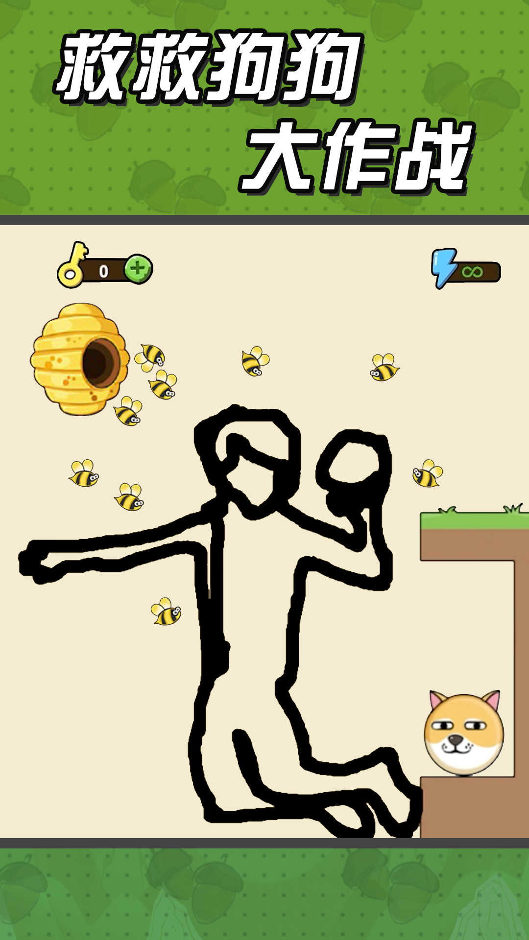 The poor dog is about to be attacked by bees, and the dog's head is trapped by a honeycomb at the moment of the attack, you need to use your imagination to draw a line to rescue it, go!go!go!