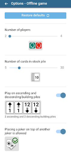 • Choose whether you want to play classic with «four ascending building piles» or with «two ascending and two descending building piles»