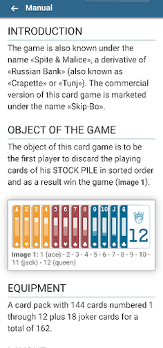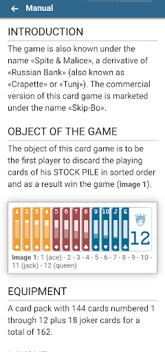 The object of this card game is to be the first player to discard all the playing cards from his deck in the order 1 to 12 and thus win the game.