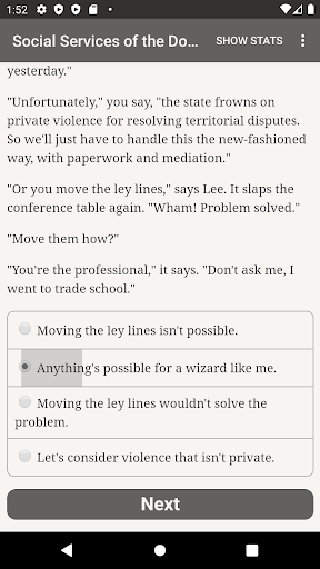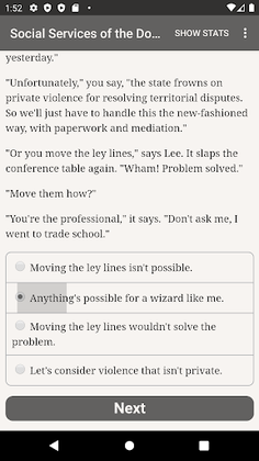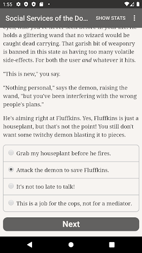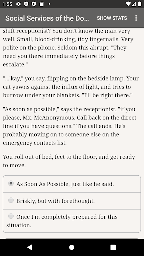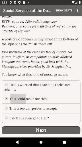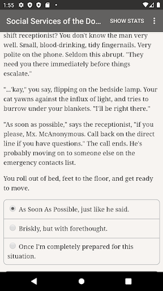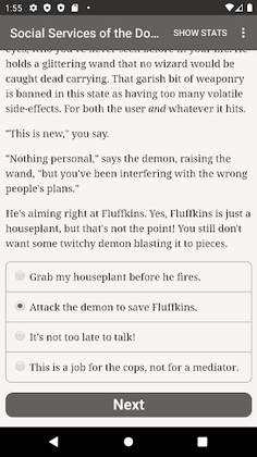 "Social Services of the Doomed" is a 400,000-word interactive urban fantasy novel by Fade Manley. It's entirely text-based, without graphics or sound effects, and fueled by the vast, unstoppable power of your imagination.