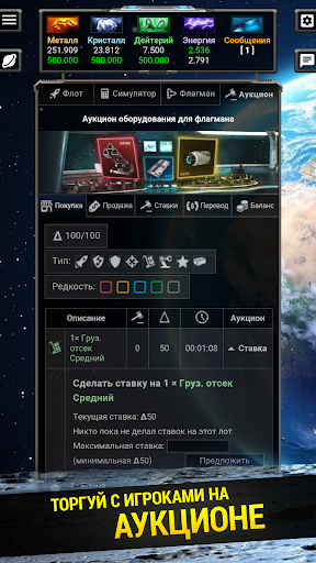 ★ Не только война, но и экономика! Кредиты – игровая валюта, которую можно найти в экспедиции. Торгуйте с игроками на аукционе, покупайте у них модули для флагмана и артефакты, или оплачивайте их услуги.