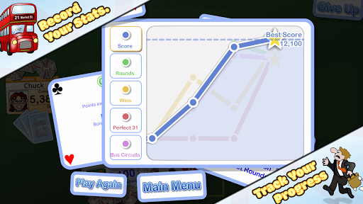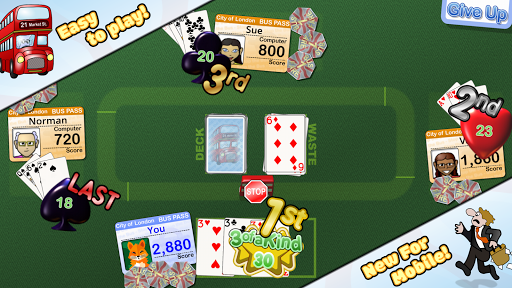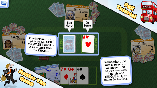 Here's the objective: each player starts with three cards and aims to get as close to 31 points with a single suit. A set of three cards with the same number also scores 30 points. Aces have the highest value of 11 and picture cards are worth 10. When it's your turn, tap the deck to draw or the waste to pick up the top card. If you think you have a good score, stop the bus! Discard a card from your hand and let the bus move on to the next player.