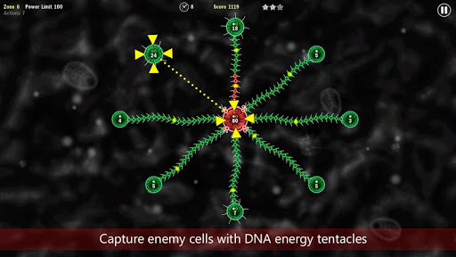 Challenge yourself to make the impossible possible by capturing enemy cells and curing the organism. To do this, draw a line between green antibody and red enemy cells and launch DNA tentacles to drain energy from the enemy cell cores. Keep your energy supply in check and enhance your attacks by cutting the tentacles. With careful strategy, capture all enemy cells to secure a zone, cure all zones, and save the life form from extinction.