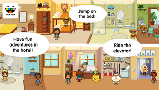 With Toca Life: Vacation, you can play with 34 new characters and create unique stories. X-ray luggage or people at the airport, feast on your favorite delicacies at the hotel buffet, or raid the fridge in your hotel room. Play on the hotel elevator or travel up to the top floor to appreciate the view from your penthouse suite. Take photos in the cut-out figures, snatch souvenirs from the gift shop, or snack on the boardwalk. Engage in beach games and surf above the ocean animals.