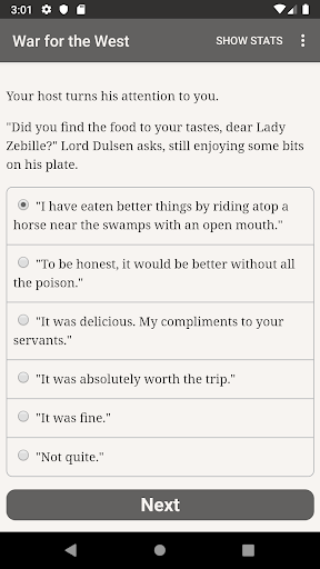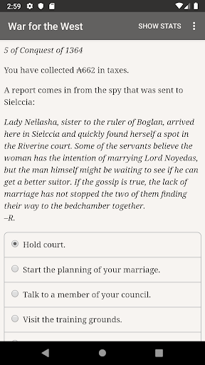 Step into the shoes of a provincial ruler and dispense justice to your subjects, resolve disputes and hold court in War for the West, a gripping and dark interactive medieval fantasy novel comprising over 485,000 words written by Lucas Zaper. As a leader, you will be trusted to manage the treasury, allocate funds and ensure that they are spent wisely on local improvements and personal needs. Additionally, you will be expected to maintain diplomatic relationships with other leaders and find a suitable partner for marriage. Not only is this for the continuation of your lineage but also for the consolidation of power and alliances.