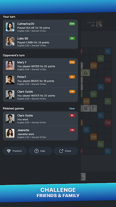 Create and place words on the 15 by 15 tile board and earn points for creativity and placing letters on the high scoring Double Letter, Double Word, Triple Letter and Triple Word tiles.