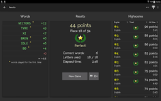 In the internal word list you can find all the words you ever played. The local highscore list helps you keep track of your achievements. You can also upload and compare your scores with other players in the online ranking list.