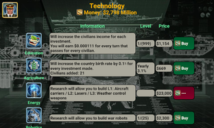* Resources, Factories, Stock Exchange, Weapons Markets, Diplomats, Alliances, United Nations, a Spy Center, a War Room, an Economic System, Technology, World Events, World News, and advanced Artificial Intelligence.